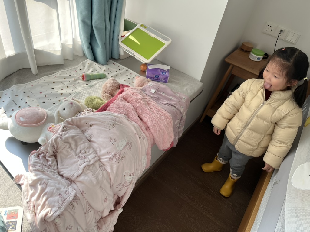 发现有二胎之后,小玥子就独自跟着我睡(否则她半夜醒了基本只要妈妈抱,会影响孕妇休息),只要不半夜起来玩一个小时,都还算好带。夜里她会想要找妈妈,但是基本上哄一哄都可以应付过去。